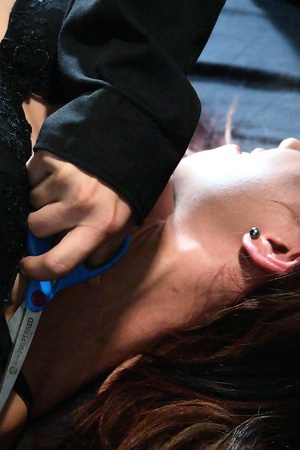 Cruel femdom Aiden Starr binds and laces her busty slave Claudia Valentine then penetrates her ass